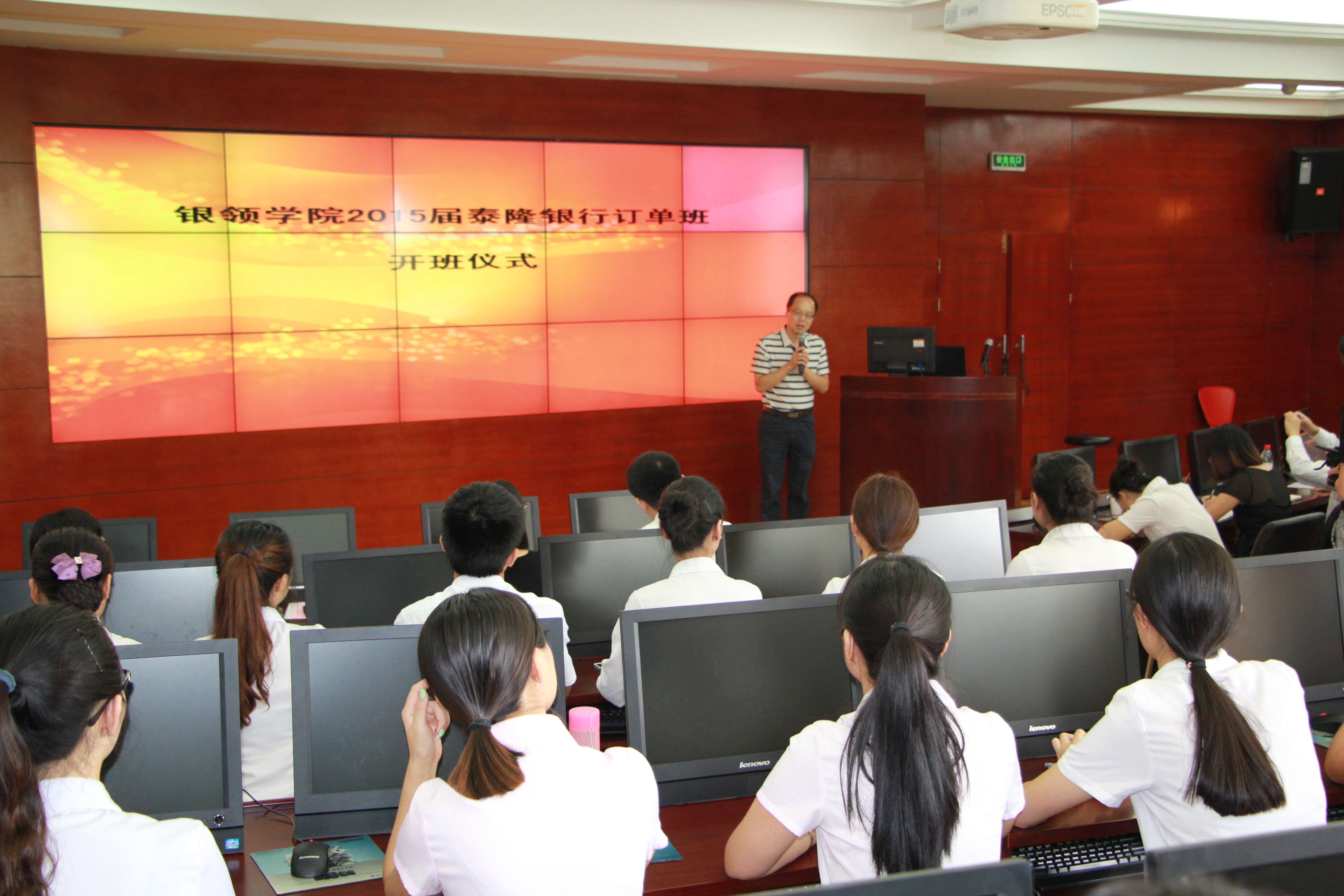 2014年9月17日,7790cnm必发集团2015届浙江泰隆商业银行订单班开班仪式在光大教学楼9205举行,公司党总支书记、副经理王祝华,浙江泰隆商业银行人力资源部员工配置中心主任郑玲,泰隆公司教务中心主任沈莹,杭州城东支行业务二部总经理、2011届泰隆银行订单班毕业生薛良良,人力资源部拓聘经理顾巍伟和7790cnm必发集团2015届泰隆订单班全体同学出席了开班仪式,仪式由班主任蒋含真主持。