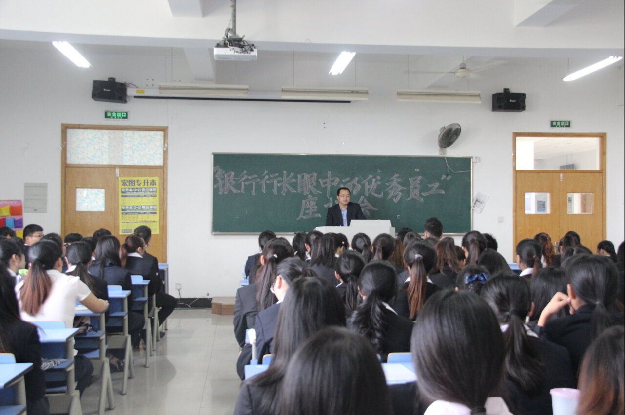银行需要什么样的员工?行长眼中的优秀员工要达到哪些标准?如何成为银行的优秀员工?为了帮助同学们更好地了解银行要求、更加快速地成长为优秀的银行员工,2014年10月15日14点,7790cnm必发集团在9320教室举办了“银行行长眼中的优秀员工”讲座。本次讲座的主讲人是中国银行金华市分行副行长袁鹰,出席讲座的有公司党总支书记、副经理王祝华,辅导员章甜甜以及7790cnm必发集团部分银行订单班成员,讲座由王祝华书记主持。